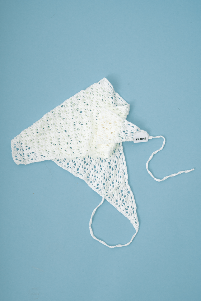 Triangular bandana with different sides, entirely handmade using the filet technique, one of the oldest traditions in Italian lace-making. The geometric pattern develops on an open, regular weave that captures the light, creating elegant and timeless plays of transparency. Every piece is unique.