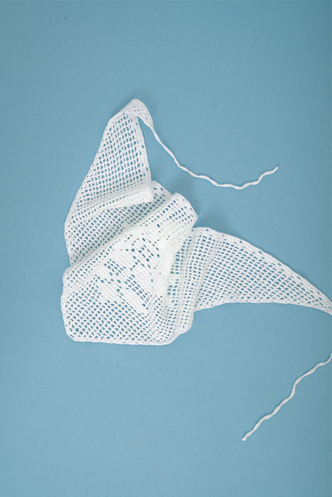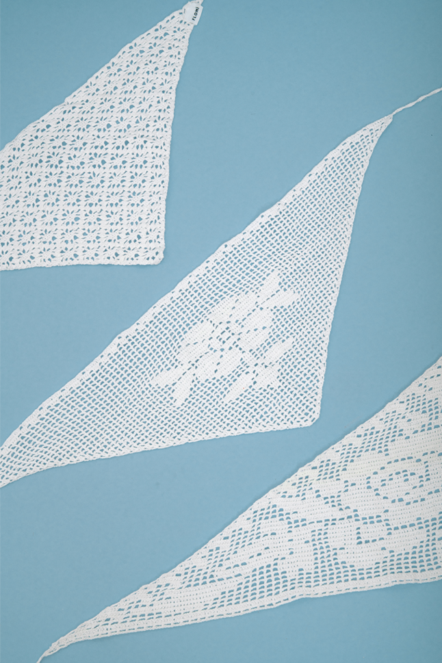 Triangular bandana with different sides, entirely handmade using the filet technique, one of the oldest traditions in Italian lace-making. The geometric pattern develops on an open, regular weave that captures the light, creating elegant and timeless plays of transparency. Every piece is unique.