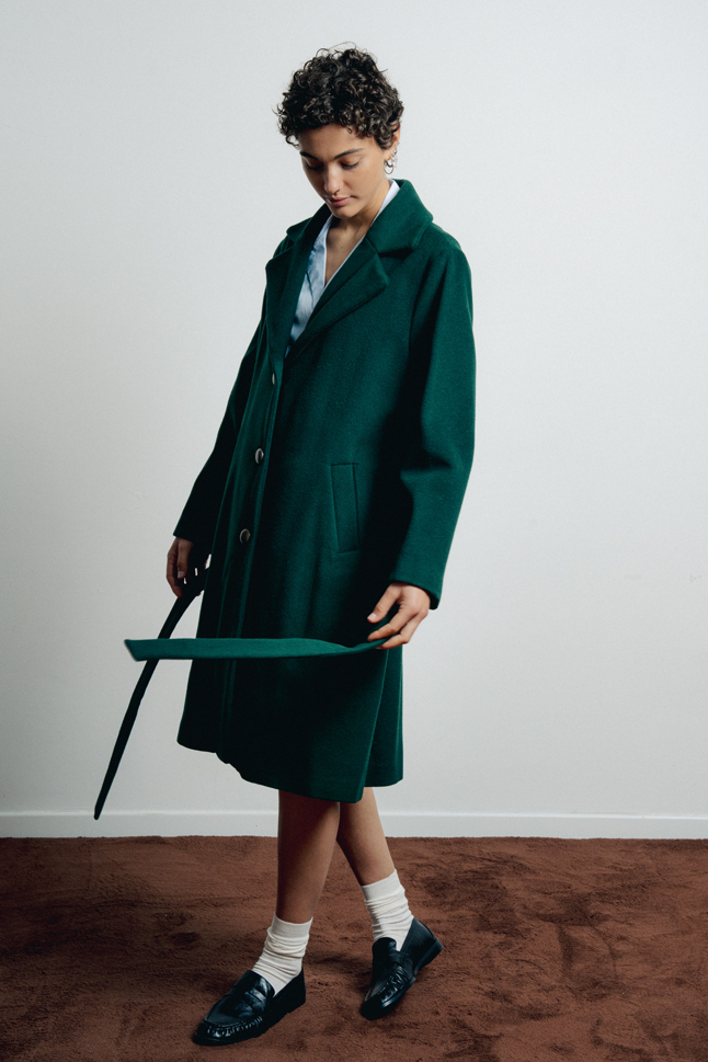 Cappotto monopetto a 3 bottoni con rever e cintura rimovibile. Alma è realizzato in lana verde bosco, con una mano morbida.