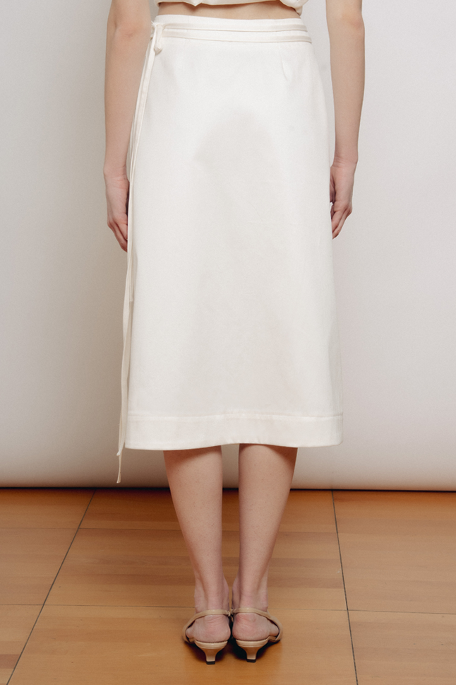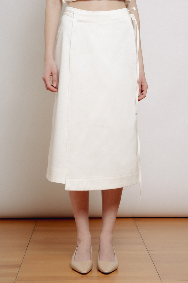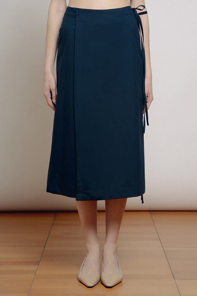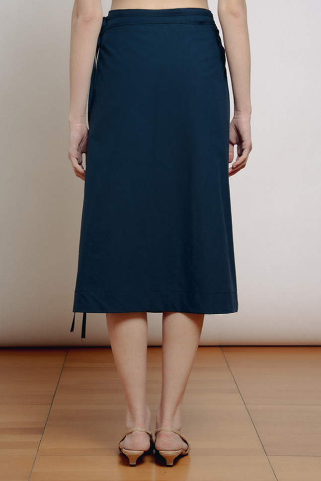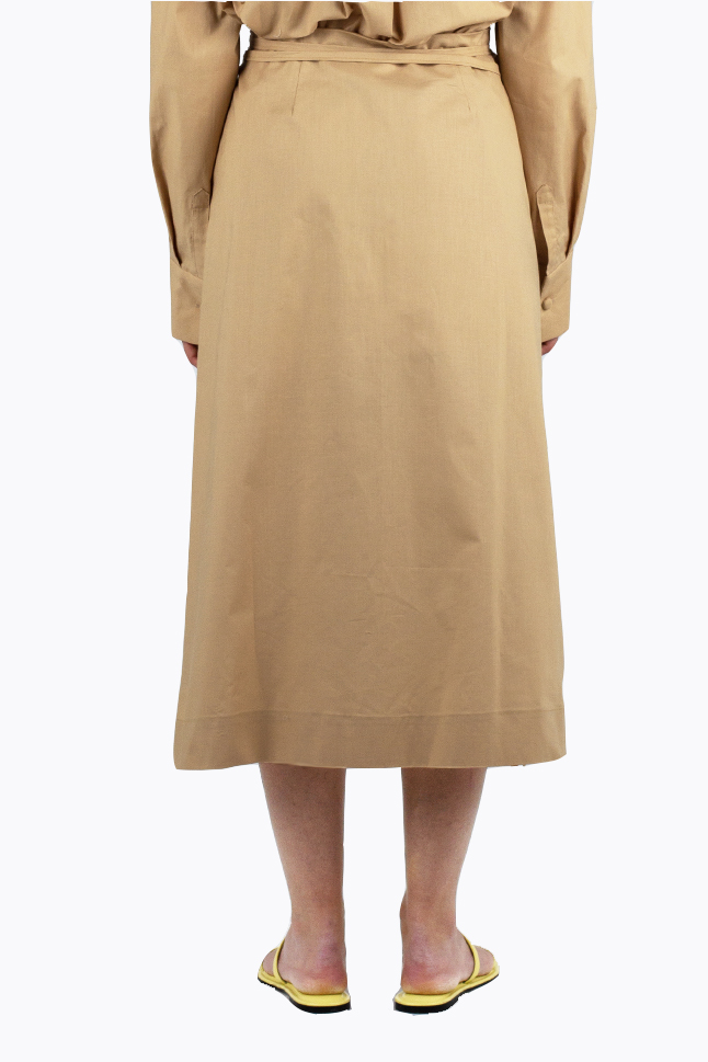 Gonna midi a portafoglio, con doppia allacciatura in vita. Questo modello è regolabile e si adatta alle varie fisicità.
