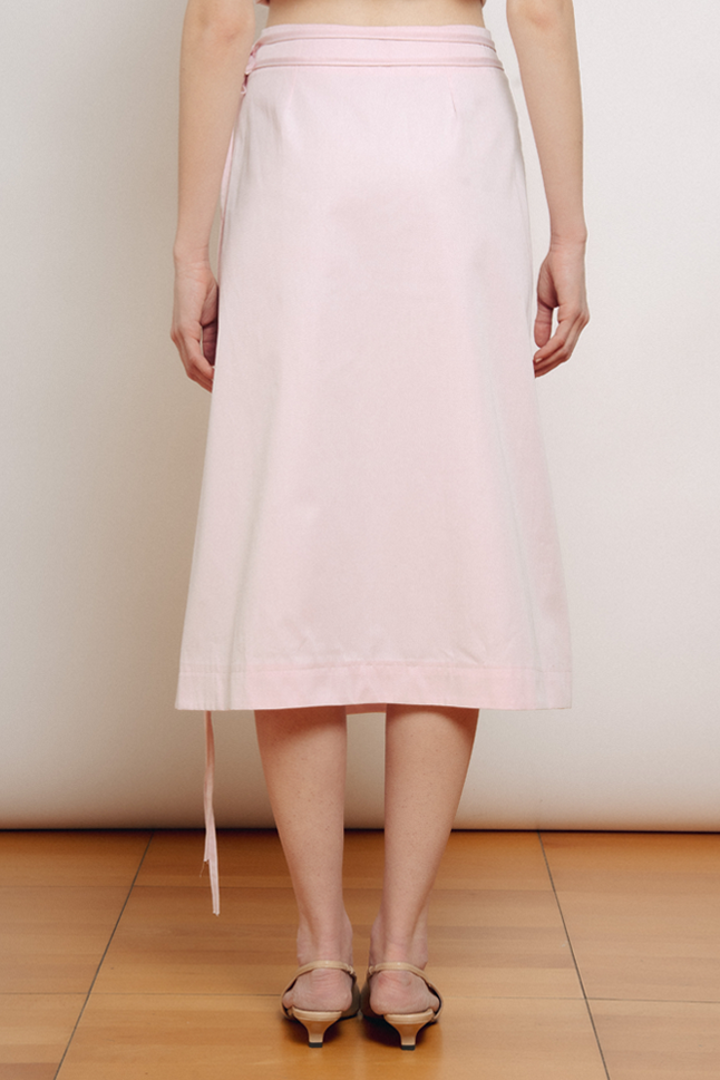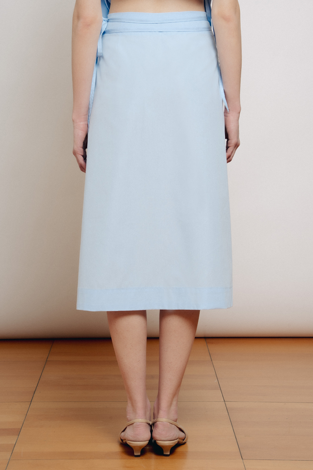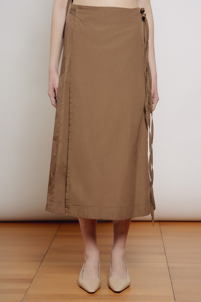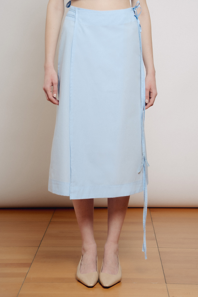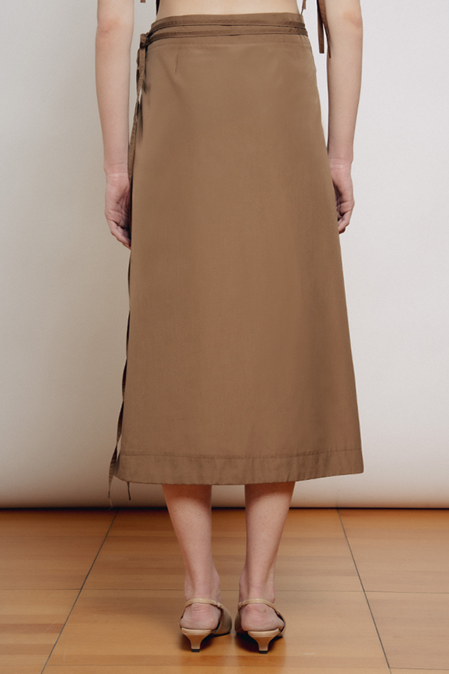 Gonna midi a portafoglio, con doppia allacciatura in vita. Questo modello è regolabile e si adatta alle varie fisicità.